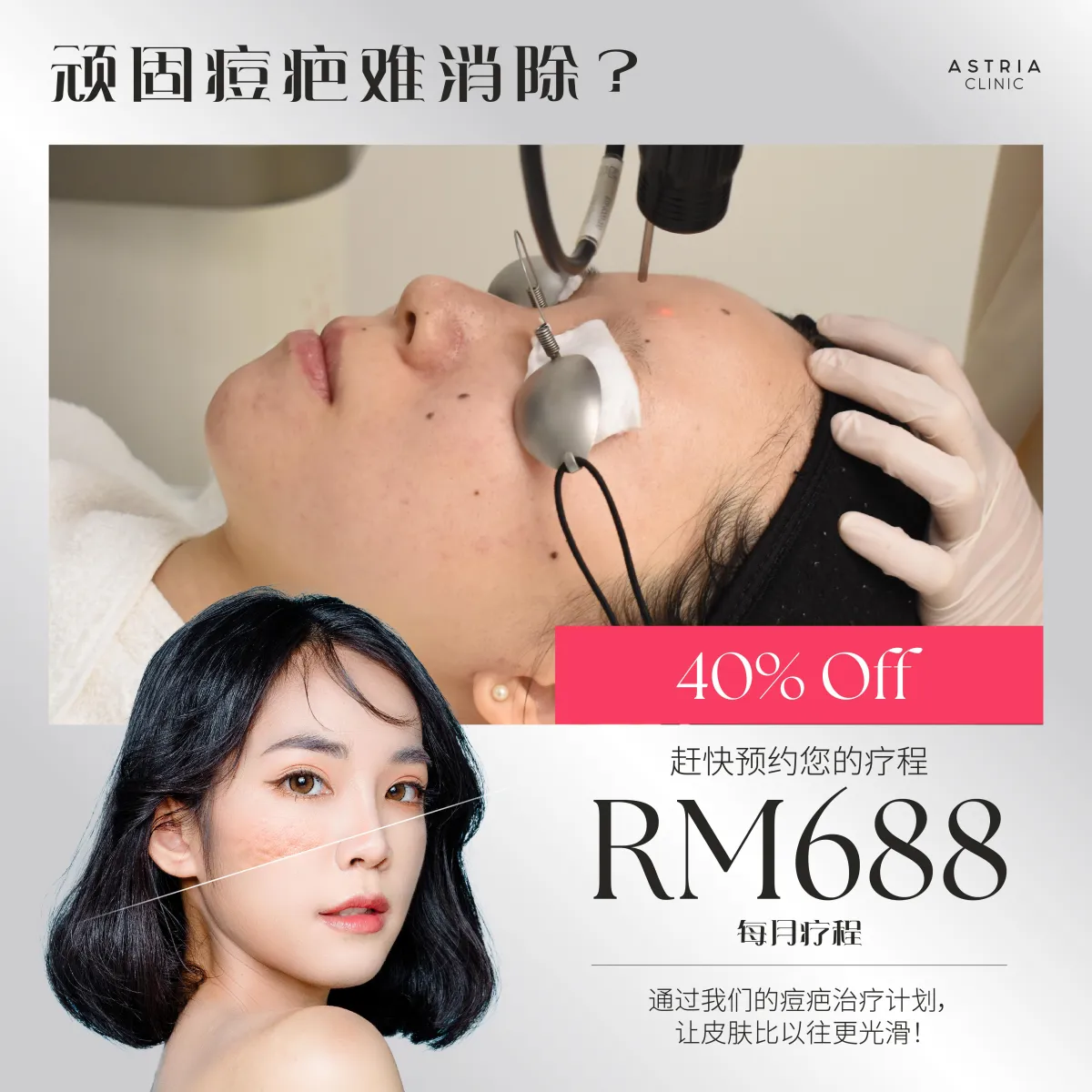 我们的先进去除痘疤计划可以帮助你实现那清晰光滑的肌肤。限时享受40%折扣,每月仅需RM688。